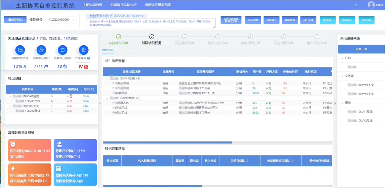主配協同故障診斷與自愈控製係統實現在主網發生故障時,通過主配全要素協同控製解決饋線負荷大麵積、長chang時shi間jian停ting電dian問wen題ti。通tong過guo係xi統tong全quan麵mian地di分fen析xi配pei網wang運yun行xing數shu據ju,對dui於yu主zhu網wang故gu障zhang開kai展zhan配pei網wang饋kui線xian負fu荷he轉zhuan移yi,提ti供gong多duo選xuan擇ze饋kui線xian轉zhuan供gong方fang案an,並bing自zi動dong選xuan擇ze最zui優you轉zhuan供gong方fang案an,提ti升sheng主zhu網wang故gu障zhang轉zhuan供gong能neng力li,減jian小xiao主zhu網wang運yun行xing風feng險xian。