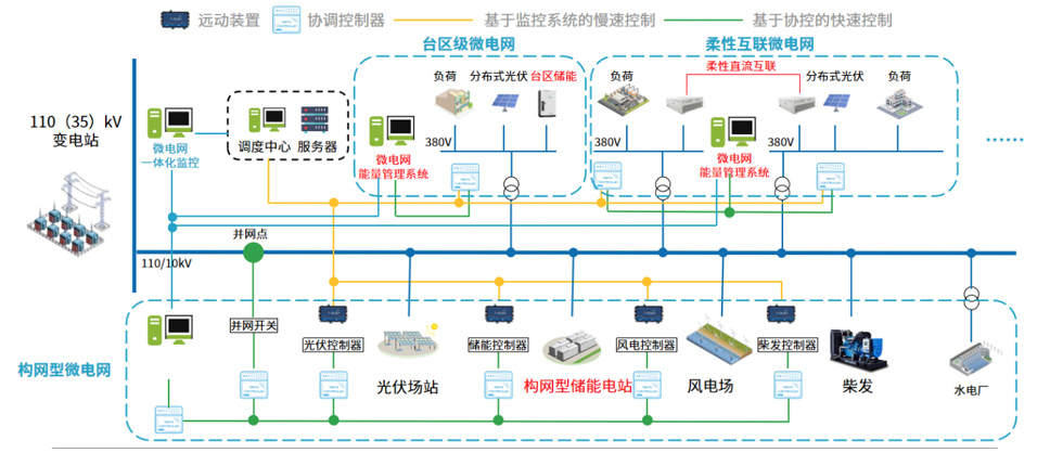 方案包括台區級微電網、柔性互聯微電網、構網型微電網以及微電網群。微電網係統方案集成分布式電源、儲能係統和智能管控平台,對光伏電站、風電場、儲能、可調負荷進行實時調控。該方案主要應用於海島、鄉鎮、工業園區、偏遠地區等