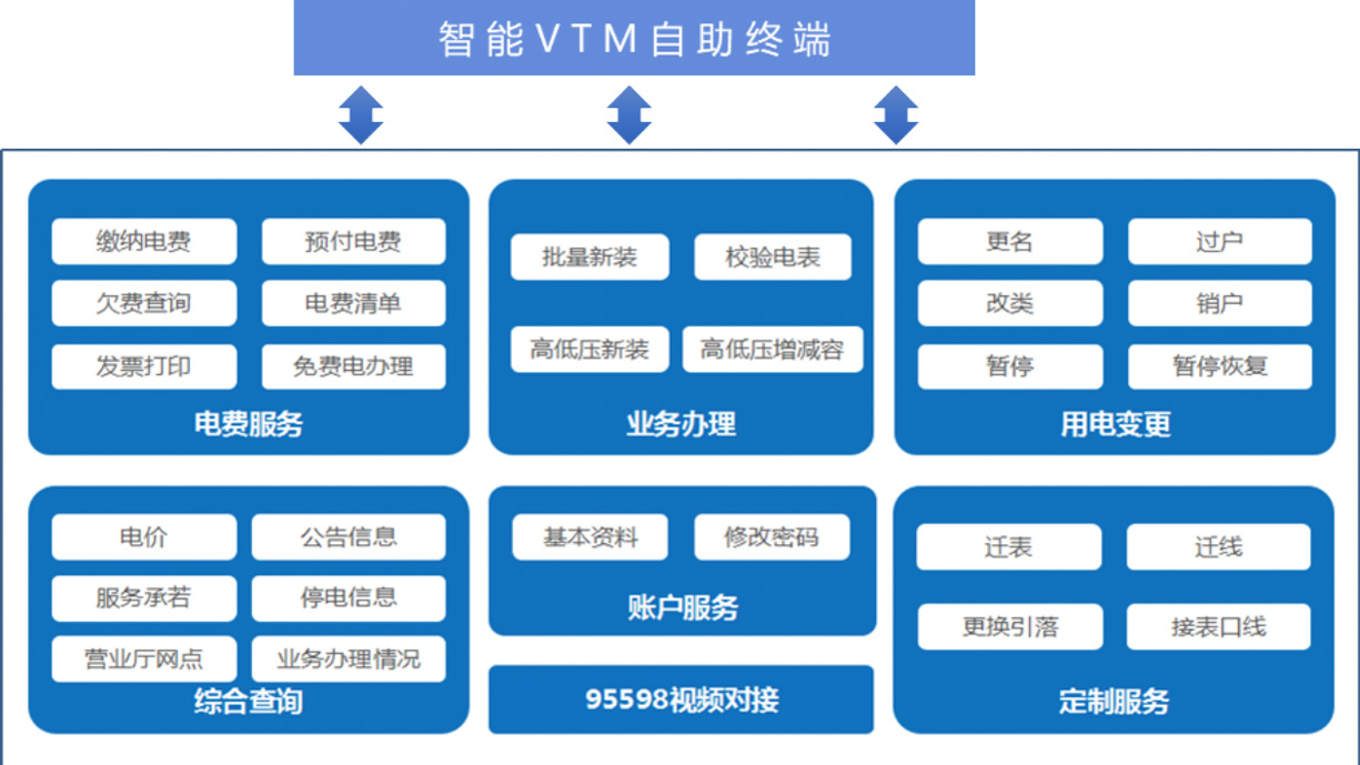 智能VTM自助服務終端融合傳統電力營業廳的服務功能,是集業務辦理、電費服務、綜合查詢、賬戶服務、用電變更、定製服務等多功能於一體的智能化互動服務平台,也是實現電力企業與客戶之間友好互助、為客戶提供智能化和多樣化互動服務的一站式電力客戶服務和展示平台。與傳統的ATM相比,VTM功能更全麵,能夠取代90%以上的傳統人工櫃台服務,並且能夠填補櫃台麵對麵服務與自助服務之間的空缺,並為客戶提供7X24小時不間斷的信息服務。